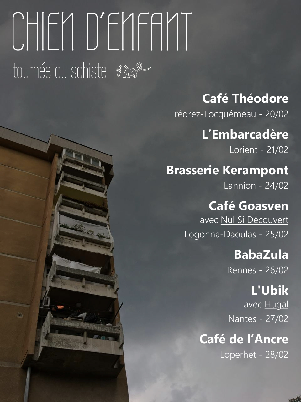 La musique de chien d’enfant c’est un peu comme une balade littorale en fin d’hiver : une atmosphère saline chargée d’embrun, percée par des rayons qui réchauffent. Qui sèchent. Chien d’enfant c’est du garage, de la pop, du rock, naïf et chargé de chaleur et de mélancolie.