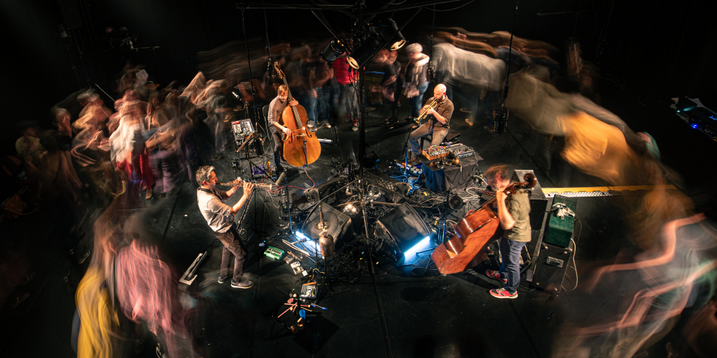 Dans cette nouvelle création, les musiciens de No Tongues explorent la notion de répétition et de pulsation, issues de rituels et de cérémonies séculaires. Le groupe cherche à créer une forme d’ivresse qui invite au mouvement et à la circulation, comme pour profiter d’un kaléidoscope aux multiples facettes.